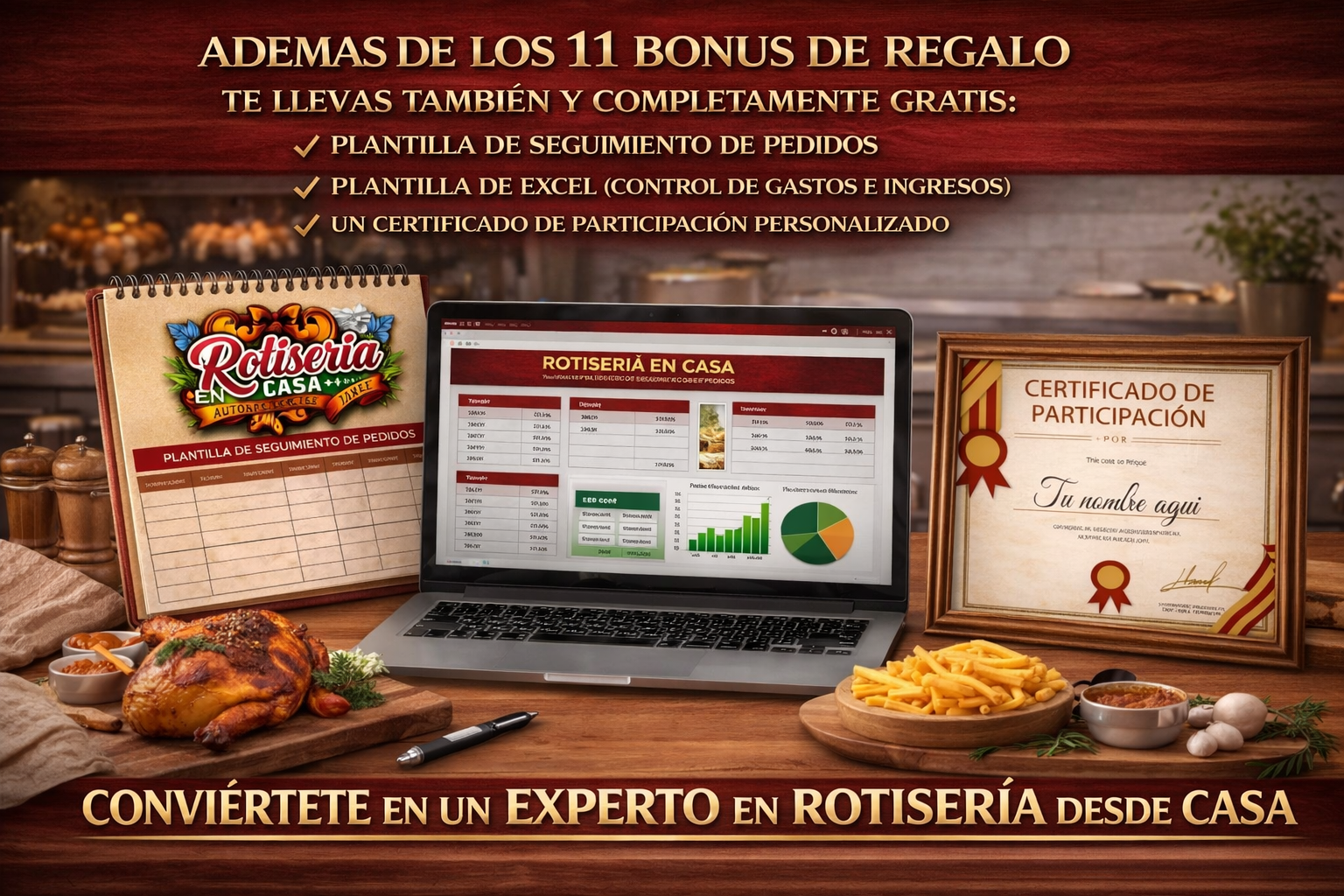 Todo lo que necesitás para montar tu rotisería en casa, incluso si nunca vendiste comida antes. Aprendé cómo preparar recetas rendidoras y que se venden todos los días paso a paso y llevate 11 BONUS EXCLUSIVOS GRATIS para sumar productos, aumentar el ticket y vender más. ⏳ Oferta disponible solo por tiempo limitado.🔥